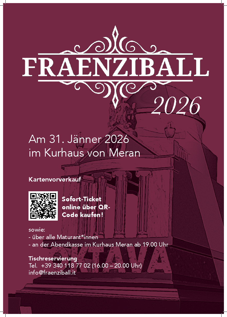 DAS Ballereignis 2026 steht vor der Tür - am 31. Jänner lädt die Oktava 2026 zum traditionellen Fränziball im Kurhaus von Meran. Neben kulinarischen Genüssen vom Försterbräu und erlesenen Tropfen von der Kellerei "Lieselehof" erwartet die Besucher auch Musik für jeden Geschmack und alle Altersstufen. Tickets können wie immer vorab online (hier geht es zum entsprechenden Link) oder aber ab 19:00 Uhr an der Abendkasse gekauft werden. Nähere Infos finden sich unter www.fraenziball.it. Und für alle, die schon vorab in Stimmung geraten wollen, hier zur Einstimmung ein kurzer Stimmungsmitschnitt aus den letzten Jahren. Ein kurzer Klick auf das Plakat - los geht´s!