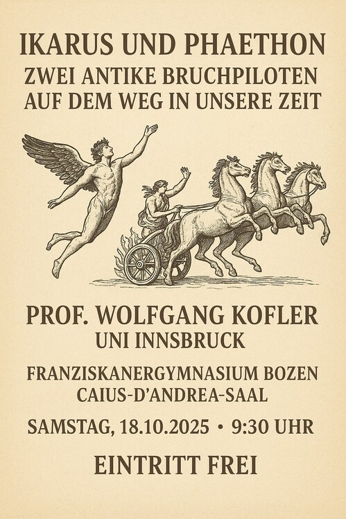 Mit dem Beginn des Schuljahres starten auch wieder die vom Förderverein der Schule organisierten Expertenvorträge am Franziskanergymnasium. Den Auftakt zur heurigen Referatsreihe macht Univ.-Prof. Wolfgang Kofler. Der ehemalige Absolvent des Franziskanergymnasiums lehrt am Institut für Sprachen und Literaturen an der Universität Innsbruck Latein und Griechisch. Einer seiner Forschungsschwerpunkte ist dabei die Antikerezeption. Dem trägt auch sein Vortrag am kommenden Samstag (18. Oktober) Rechnung, der unter dem Titel Icarus und Phaethon: Zwei antike Bruchpiloten auf dem Weg in unsere Zeit steht.