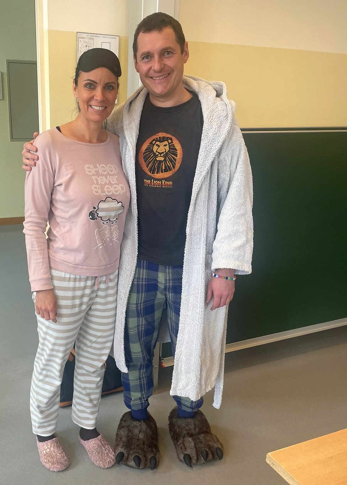 Trotz Pyjama hellwach im Unterricht: Prof. Hertscheg und Prof. Weger