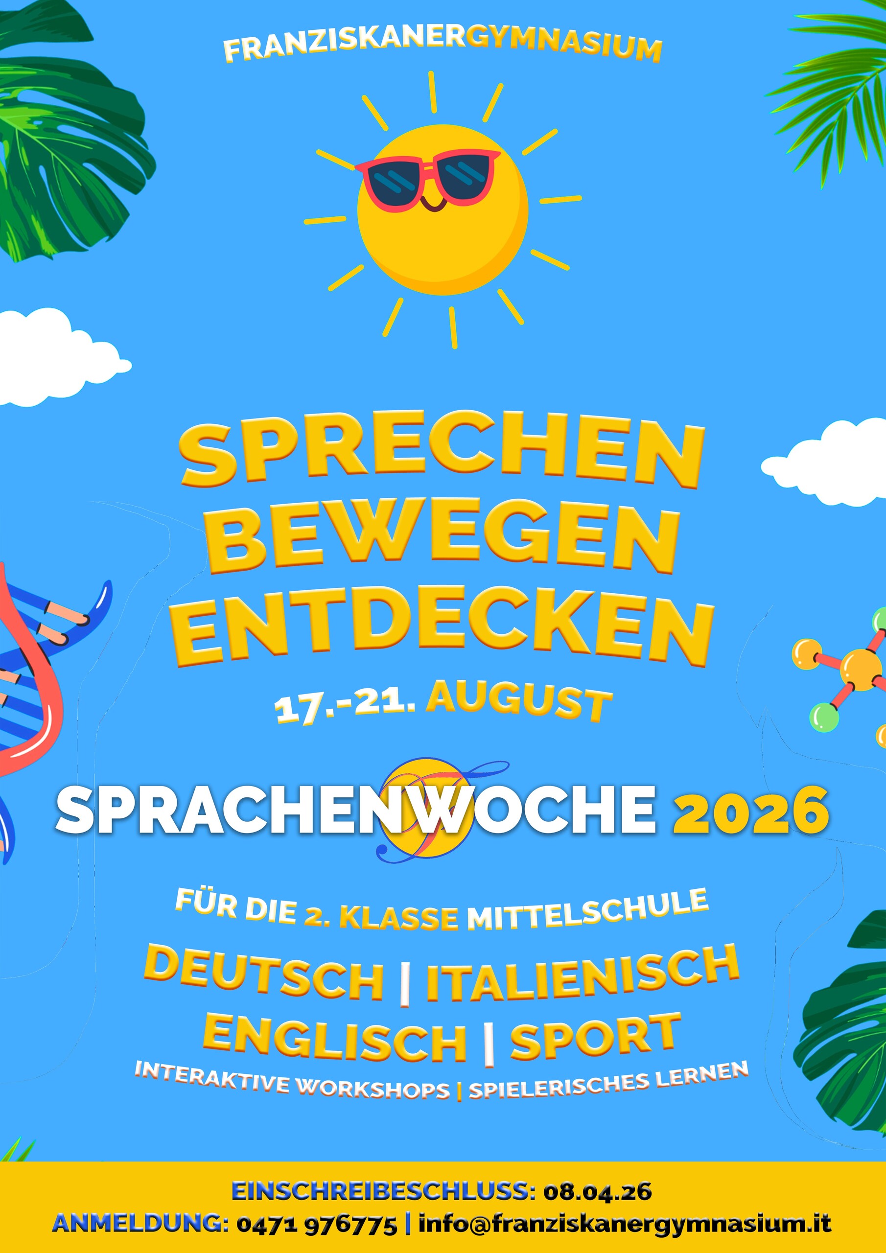 Dann ist die Sprachenwoche S³ am Franziskanergymnasium genau das Richtige für dich. Vom 17. bis zum 21. August kannst du zusammen mit Prof. Tom Smith (Englisch), Prof. Tobia Maio (Italienisch), Prof. Lukas Oberrauch (Deutsch) und Prof. Benjamin Mayr (Sport) 5 Tage lang an deinen Sprachskills arbeiten - ohne dass dabei der Spaß zu kurz kommt. Der Kurs dauert jeweils von 8:30-12:30 Uhr. Anmeldungen können bis 8. April im Sekretariat der Schule (0471/976775 oder info@franziskanergymnasium.it) vorgenommen werden. Die Teilnehmerzahl ist auf 25 Schüler begrenzt.