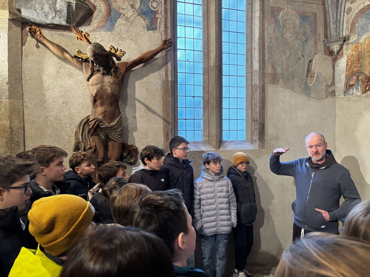 P. Benedict mit den Schülern der 2. Klasse vor den mittelalterlichen Fresken im Innenbereich des Klosters