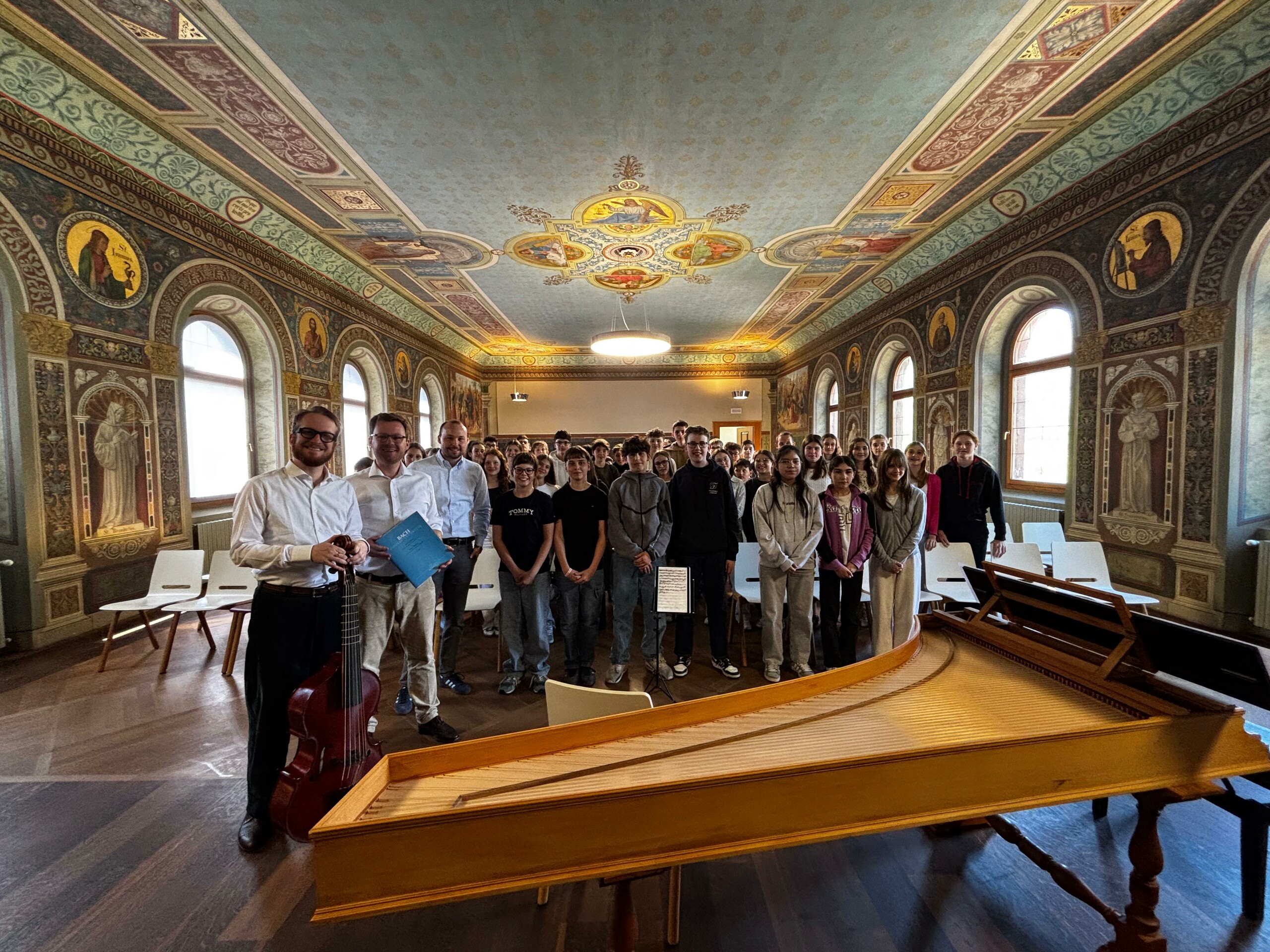 Auf Initiative von Prof. Matthias Berardo und Prof. Tobias Simonini wurde heute im ehrwürdigen Cajus-Saal – der ehemaligen Schulkapelle unseres Gymnasiums – Kammermusik auf höchstem Niveau dargeboten. Die beiden international tätigen Musiker Marian Polin (Cembalo) und Mauro Colantonio (Viola da Gamba) öffneten den Schülerinnen und Schülern durch ihr Spiel ein Fenster in die Barockzeit. Zur Aufführung gebracht wurde die Sonate in G-Dur (BWV 1027) von keinem Geringeren als Johann Sebastian Bach.
