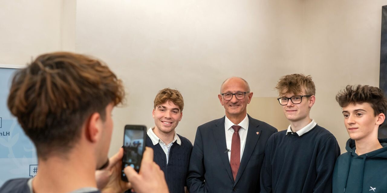 Aufstellung für das obligatorische Selfie: Maximilian Heinel, LH Anton Mattle, Maximilian Gasser und Jakob Schönweger